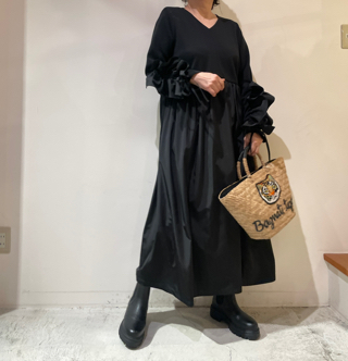 カットソー素材とタフタの組み合わせ、