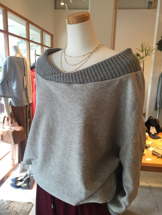 C+のオフショルダーリブニットに